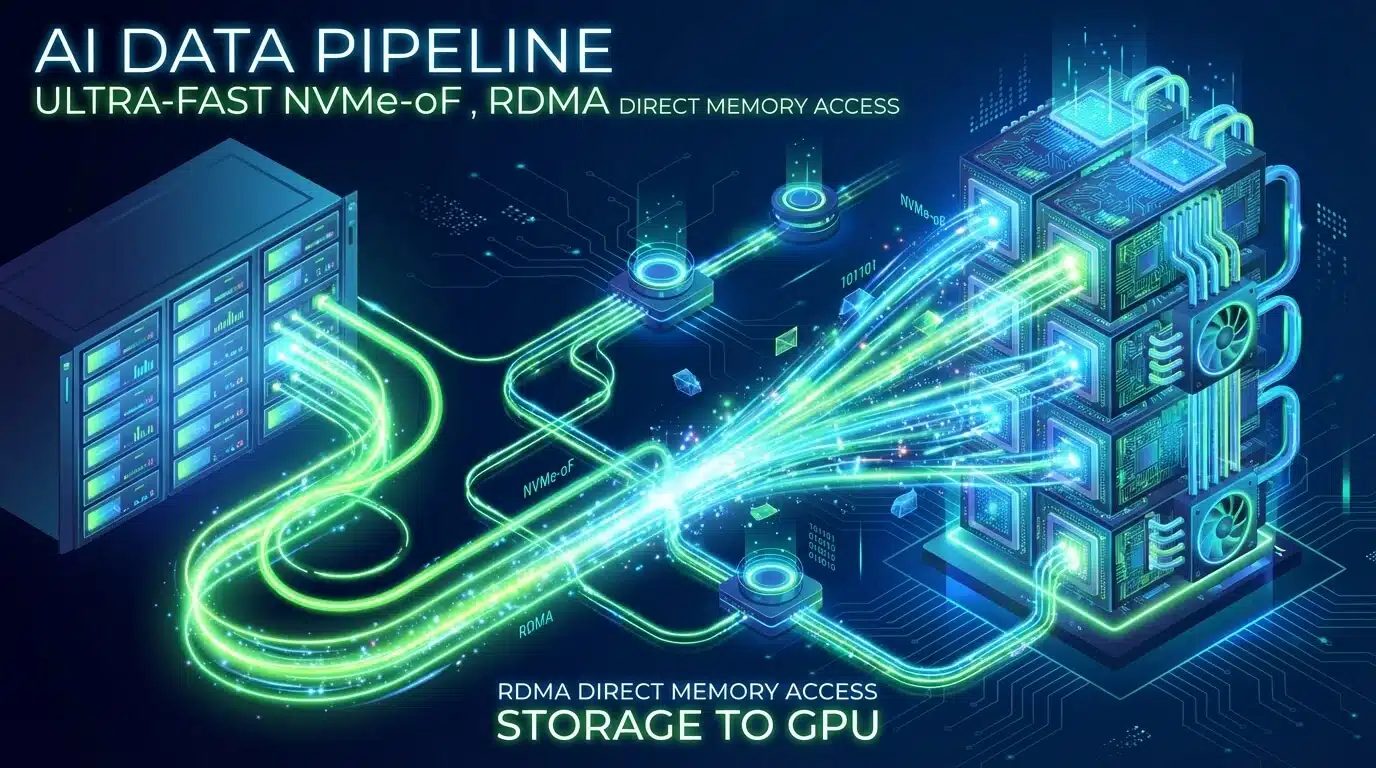 The secret sauce of high-performance AI storage is Remote Direct Memory Access (RDMA). Using protocols like RoCE v2 (RDMA over Converged Ethernet), storage servers can write data directly into the memory of the GPU server, bypassing the CPU entirely.