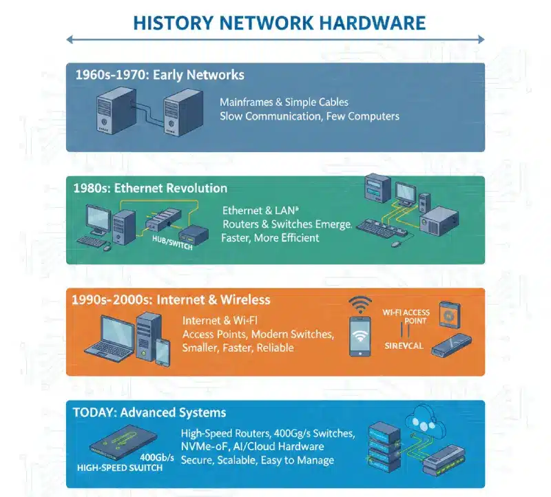 The story of network hardware starts with the earliest computer networks in the 1960s and 1970s. Back then, networks were very basic and used mainframes connected by simple cables. Communication was slow, and only a few computers could share data.